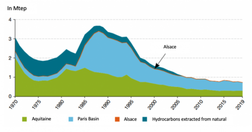 On 1 January 2019, France’s reserves of crude oil (7.7 Mtoe) and of hydrocarbons extracted from natural gas (Lacq, 0.12 Mtoe) represented around ten and a half years of operations at the current pace (which is four months less than in 2018, and a year and a half less than in 2017), and nearly one and a half months of national consumption. In 2019, the petroleum produced in France only represented about 1% of the country’s consumption, the same as in previous years.