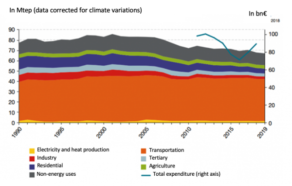 In 2019, France’s total consumption of refined petroleum products (excluding biofuels), in data adjusted for climate variations, was 67 Mtoe. It has fallen by 1.3% in a year, which is on a par with the trend observed since the mid-2000s, following a larger drop (of 3.5%) that occurred in 2018. This downward trend can largely be attributed to industry and to the residential and tertiary sectors, since petroleum use for transport has remained fairly stable since 1990. Households, businesses and administrations spent €89 billion on oil and gas products in 2018. More than three quarters of this sum was spent on meeting transportation needs.